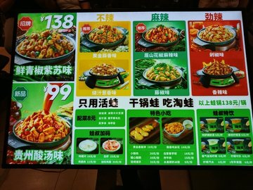 鮮青椒紫蘇味 / 水果椰奶冰粉 / 蒜香蛙 / 萵筍 / 小酥肉 / 眉山花椒麻辣味