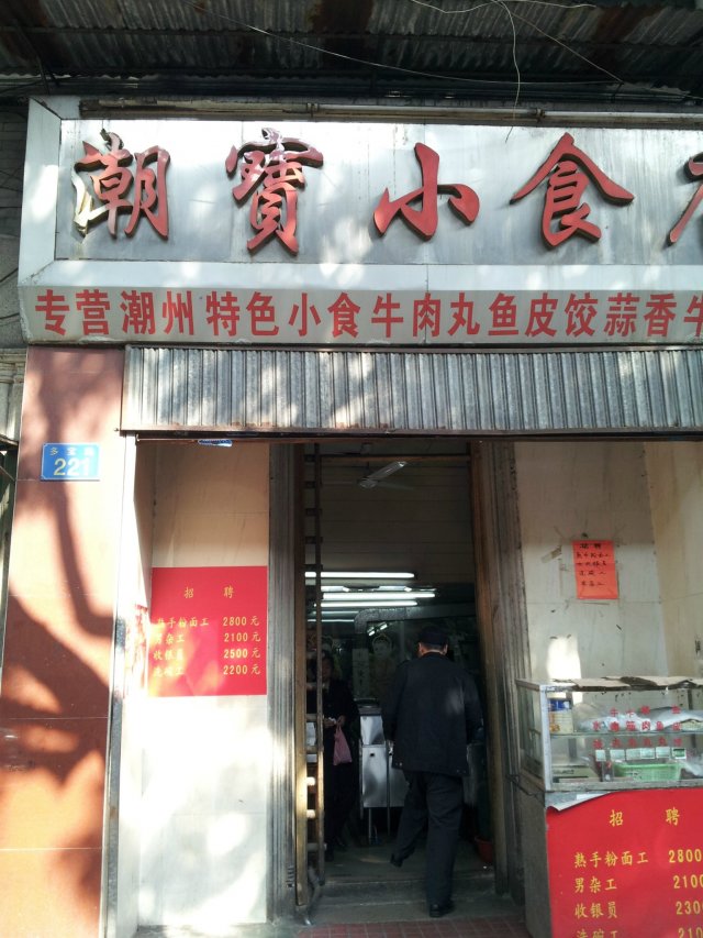 据说是一家正宗潮式特色的食店,招牌是鱼皮饺,因此来上下九就顺便过来一试。门口醒目显眼的招牌很好找,但是来的时候本来应该在入门柜台处的收银不知跑哪里去了,因此下单的时候很是花了些功夫。墙上的菜单,价目表一目了然。看了一下价钱不算特别便宜,不过还可以接受。人流量一般,桌面还算整洁干净,提供了各种酱料可供选择。点了鱼饺紫菜汤,紫菜汤底本身就是普通紫菜汤,没什么特别。败笔出在本应该是所谓招牌的鱼皮饺上。鱼皮饺的口感太韧,不弹牙。调味也很失败,汤底本身是不咸的,相当清淡,然而鱼皮饺实在是太咸了,以至于吃了之后不仅口渴,舌尖还因为过咸而隐隐作痛。结果不得不去隔壁开记点甜品来解掉满嘴的咸味。这样的招牌实在让人大失所望,以至于完全不可能对其他的菜式有什么期待。出品太糟糕,应该不会再过去了。查看更多
