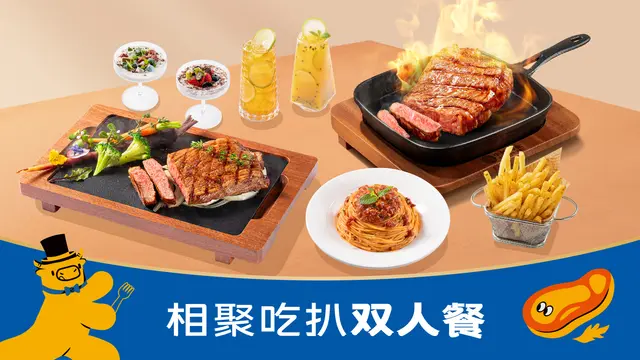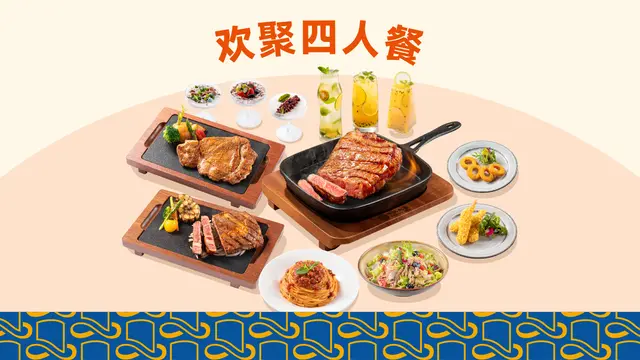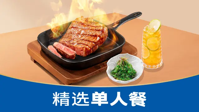 火焰厚切雪花牛排 / 招牌牛肉醬意面 / 金槍魚鮮蔬沙拉 / 厚切香草雪花牛排 / 紅豆牛奶凍 / 青檸百香果汁