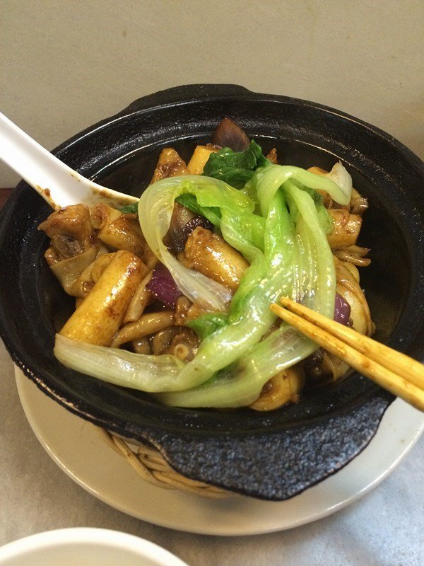 老城区的小食店,店面挺宽的,但比较简陋,可以挑选的食物品类比较多,价格也很划算。排骨煲仔粉,比煲仔饭做的时间快很多,所以就选了这个。铁煲整个上来的,很烫,里面的粉是猪肠粉,油很多,但是很香。排骨比较大块,但是骨头占了大部分。还有一点的生菜,自己吃一份是足够了,就是吃完了下面的油还剩很多,比较油腻。查看更多