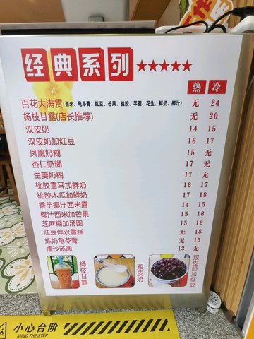 鳳凰奶糊 / 百花大滿貫 / 姜撞奶 / 芝麻糊湯團 / 紅豆龜苓膏 / 綠豆海帶加雪耳(凍)