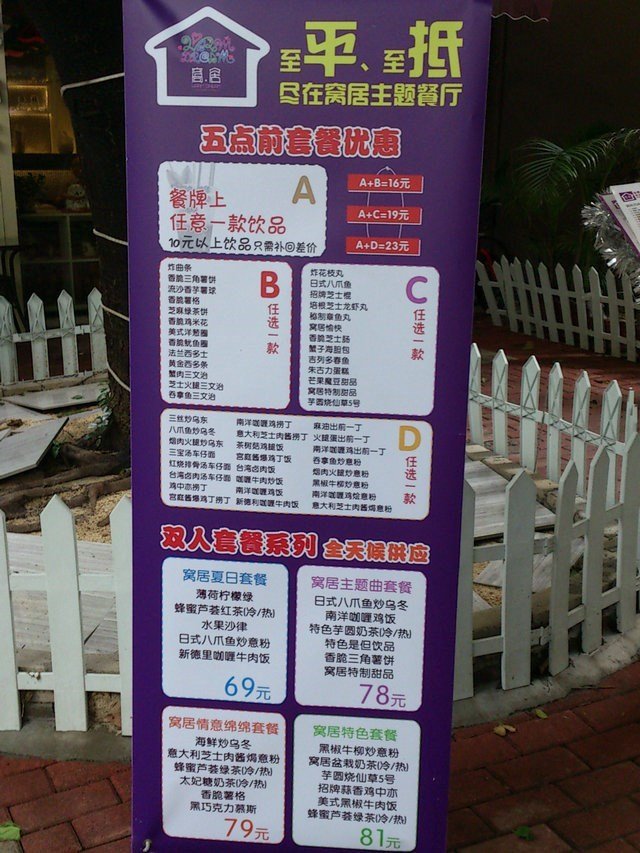 跟3个朋友聚餐,看了一下江南西的团购,觉得这家的评价和环境都不错,就买了2个双人餐的团购。我们是周一晚上去的,餐厅不大,座位不多,也比较挤,不过是那种沙发的座椅,比较舒服。我们8点到,已经满人了,刚好有一桌埋单,坐下后服务员就拿出菜单让我们选菜。- 窝居秘制咖喱鸡饭:中规中矩,没什么惊喜。- 梦想海鲜芝士焗饭:很少海鲜,只有两只虾和几根小八爪鱼,饭倒挺多的,芝士味道很淡。- 窝居蜂蜜芦荟绿:还可以,味道挺清新的。- 窝居红豆奶茶:太甜,奶精味太浓。- 新鲜水果沙律:挺大盘的,水果也比较新鲜。- 首创芋圆布丁烧仙草:这个甜品就是把芋圆、红豆、布丁、烧仙草和啫喱放在一起,其他倒还好,就是那个啫喱太甜,而且看起来就是糖精和色素的结合,个人觉得不加这个更好。- 樱桃炸花枝丸:挺香口的。- 蒜香鸡翅:朋友觉得吃不饱,就另外加了一个鸡翅,但味道太咸。- 法式香脆芝士棍:外脆内软,芝士可以拉得很长,像香口胶一样,但还是没什么芝士味。这里环境挺清净的,适合闺蜜聊天,但有个不好的地方,就是有人吸烟却没有店员阻止,可能禁烟的效果还没出来吧~另外有个貌似是老板的人过来问了我们两次觉得味道如何,我们就老实说甜品太甜,鸡翅太咸,但他却说我们是按配方做的,其他顾客都很满意,真奇怪,不接受别人意见干嘛要问……查看更多