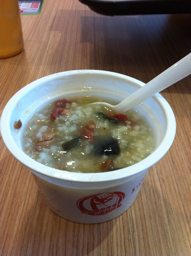 某日来这边办事。顺便吃个早餐。来得比较晚。。想吃的基本都没了啊。剩下包和皮蛋粥。不喜欢吃肯德基早餐的包,难吃。只要要了个皮蛋粥。说是皮蛋瘦肉粥,结果一吃发现是皮蛋鸭胸肉粥。卖相十分一般。水水的。。可能卖剩的就是这样吧。囧。味道嘛。。太重口味了。好咸啊配的是油条。不过不失啦~好像是六块钱一份早餐吧。呵呵。查看更多