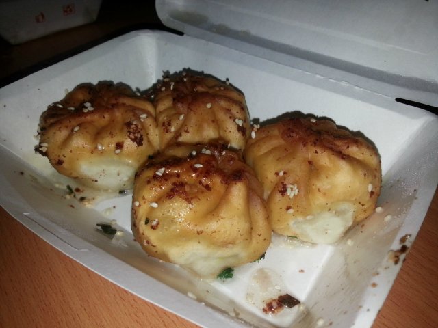 看上去其实就是生煎包,但是吃下去又和生煎包有点区别,以外卖的形式销售。每日个包子都煎得金黄色,外面包子的皮煎得很香脆,吃下去要小心,因为外面冷了,里面温度还很高。而且里面是有汁的,就像是灌汤包一样,但是这个版本是煎的灌汤包。里面都是猪肉馅,汤很热很好喝。查看更多