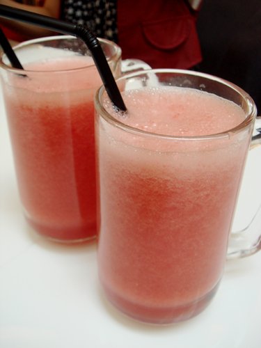 中午同同事们小聚会,五人小分队出动,哈哈,今次选址万菱汇楼下的草莓家,贪距出品够可爱。话说之前都唔知道呢度开佐间分店的,系某次同Karen讲起先知道呢度原来有间分店,于是马上就组团去食中午饭了,哈哈。中午有套餐,一个饭加一杯饮品,售价都系25左右,如果食套餐的话,可以另外加8蚊换一份原价12蚊的甜品,当然我系无抵挡得住呢个诱惑喇,哈哈,换佐一份蓝莓蛋糕。我地分别点佐几份唔同的主食,有咖喱鸡扒饭,咖喱牛腩饭,黑椒牛肉饭同板烧肥牛饭,至于饮品,就分别点佐鲜榨西瓜汁,冻奶茶同埋柚子蜜,最后甜品就只有我同小绮点了,距要佐朱古力软心蛋糕,而我就系蓝莓蛋糕。环境都系行明快,色彩的路线,睇到呢种环境食欲就已经上黎了,哈哈。鲜榨西瓜汁,据说味道有少少怪,小玲同学话好似烂西瓜的味道,所以距地都唔多中意,不过我就闻到好香的清新味道,而且睇颜色好吸引,仲有D果肉浮沉呢。柚子蜜我几中意,暖暖的,而且料都几足,又唔会话太过甜,唔错。奶茶睇上去就比较淡了,小绮表示奶味浓郁茶味唔够,属于一般之作。板烧肥牛饭,不得不说,酱汁真的不错,而且好多酱汁,捞饭一流,但系肥牛的份量就好少了,洋葱唱主角。黑椒牛肉饭据说不会太辣,味道刚刚好,但牛柳条就略嫌老佐D韧佐D,但系依仗酱汁的关系,都系食得晒的。咖喱鸡扒饭同咖喱牛腩饭于我而言应该都系差唔多味道的查看更多