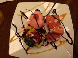 蓝蛙在艾尚天地那边,很有小资情调,环境和服务很好,价格比较的贵。这里的牛排味道不错,我也喜欢吃水果冰淇淋,里面有西瓜,菠萝切片摆盘,上面放着草莓冰淇淋球,淋上巧克力酱,吃起来冰凉爽口,很甜。查看更多