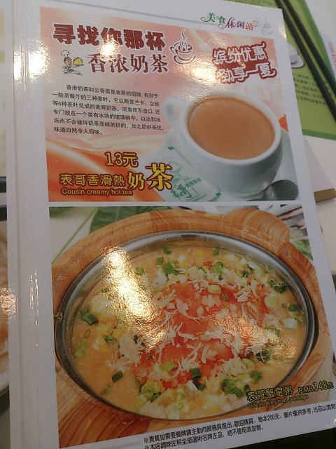 原来表哥餐厅是香港的导演/艺人-张坚庭开的茶餐厅。店面设计充满的香港老唱片/老电影的元素,令人想起那个辉煌的年代。餐前的沙拉,呃,分量有点迷你,有圣女果还有苹果。饭后的甜品,椰汁布丁不错吃哟。布丁好Q 好香浓,很香椰子味,上面还淋有淡淡的炼奶。好吃。查看更多