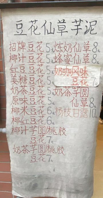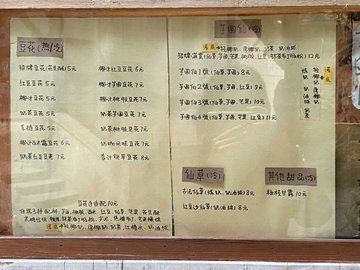 招牌豆花 / 姜糖豆花 / 椰汁芋圓豆花 / 奶茶仙草芋圓 / 紅豆豆花 / 椰汁桃膠豆花