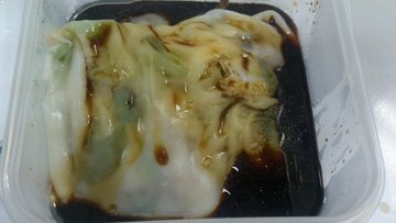 加班太饿,为了省0.5元的打包费,自带饭盒加环保。打包了一个金牌牛肉肠,大份的,牛肉有点削,估计是腌制过久的原因。里面还有生菜片。酱油很多,但是不咸,肠粉几乎都吸收那一勺酱油,感觉会不会不会那么健康呢?