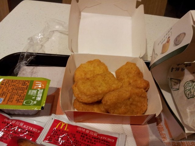 好久没有吃麦当劳了哦!逛街实在是累了,就选在了这里休息,人不是很多,而且也是比较凉快的哦!点了两杯咖啡、一份麦乐鸡还有两个派,一个菠萝派还有一个香芋派。麦乐鸡的味道不错,而且斩将也很好吃的,鸡肉外层很酥,估计是炸的比较久导致的,但是觉得这样的口感更好。派的话,香芋的更好吃,不会很甜。咖啡的话,真的觉得麦当劳的咖啡太苦了哦!两个奶,两个糖都不行,下次真的应该果断放弃了哦!查看更多