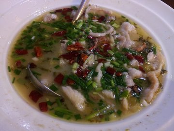 团购了148的三人餐,在一楼前台验证后自己选桌坐下,一个服务员负责差不多半个大厅,简直是忙不过来,所以都是客人自己倒水,本来叉烧和乳鸽可以二选一,但是服务员一句“乳鸽永远都不会有”的回复打击了我们的计划,上了杏汁白肺汤、叉烧、通菜肥牛,以为有菠萝包,谁知直接上了叉烧包,不过味道还不错。之后上了酸菜鱼,不过鱼肉不新鲜就没有吃,等到最后才上了黄鳝饭,没有以前那么好吃,有点小失望,三人餐四个人都吃不完,不过感觉这家分店人丁稀少,十桌八桌都是来吃团购餐的。