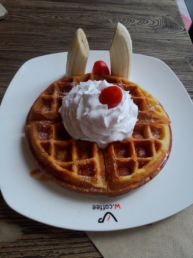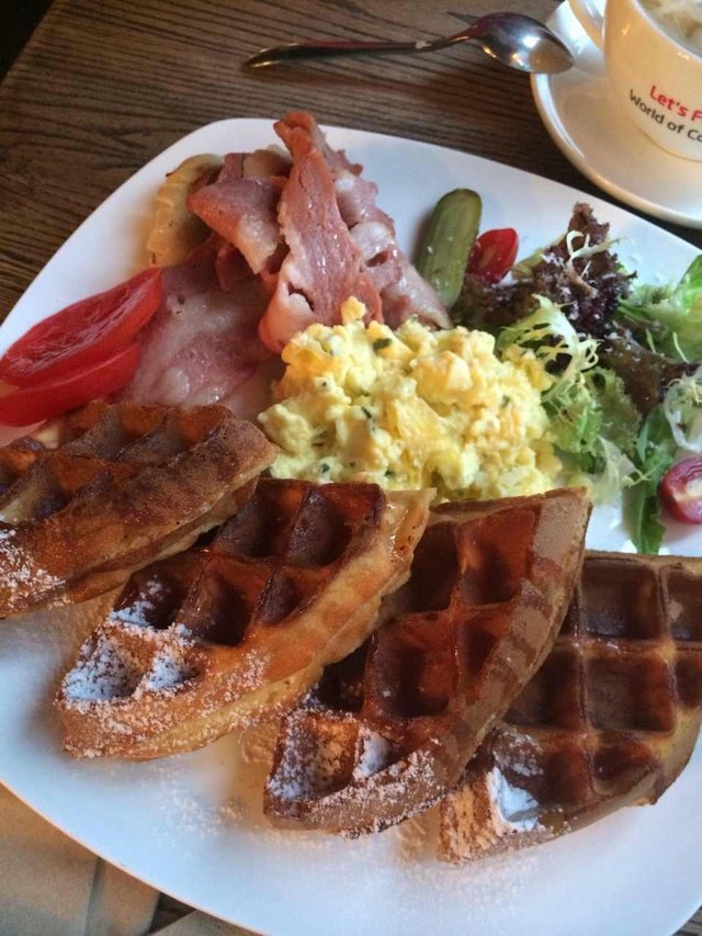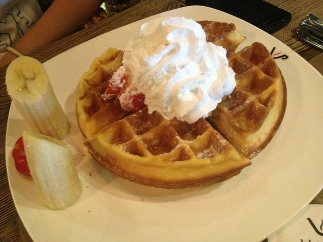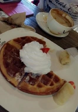 这家coffee shop环境很不错,木质的桌椅,有一个小资的田园感。下午茶最适合点上一份华夫饼和一杯咖啡。华夫饼卖相看起来还可以,上面的一坨奶油比较多,不会觉得油腻,华夫饼,稍微烤得有点焦,不过这样子更香脆,软软地,甜甜地,配上一口咖啡,咖啡苦味不是很浓,口感很滑,适合大众的口味。查看更多