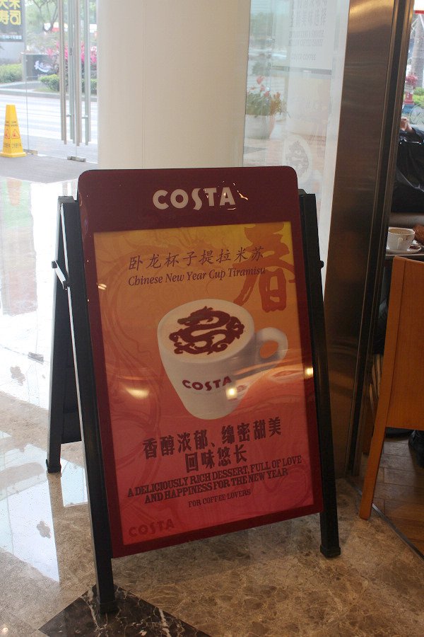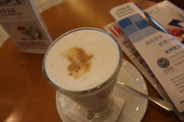 万菱汇的costa环境不错,店也不小。但是那天去到都差点没位子了。下午四点,怕喝了太浓的咖啡会影响晚上睡觉,所以选择了香草拿铁。这里的咖啡价钱跟星巴克差不多,有的略贵3、4元。由于新年将至,现在咖啡的拉花都是龙哦~~挺好看的···用一块模板做出来的拉花····