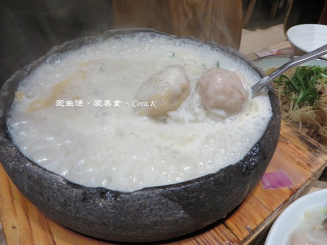 石锅鱼汤泡饭是鱼汤在滚烫的石锅内翻滚着上桌的,热气腾腾地冒着白烟,飘着鱼香,汤香饭软,一定得趁快吃,不然丝苗米泡得久了口感就差了。