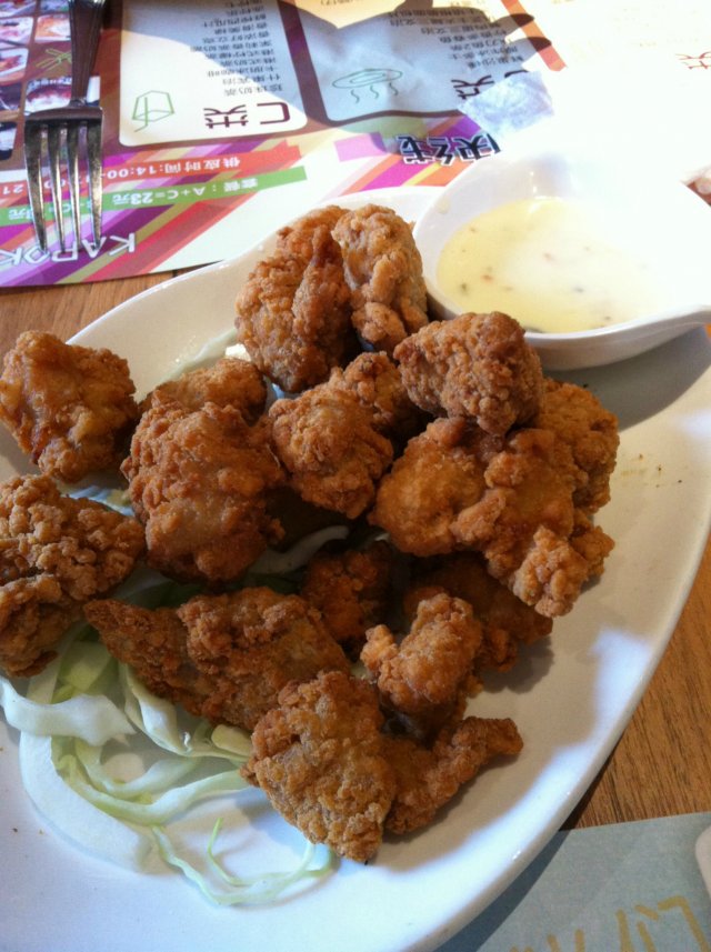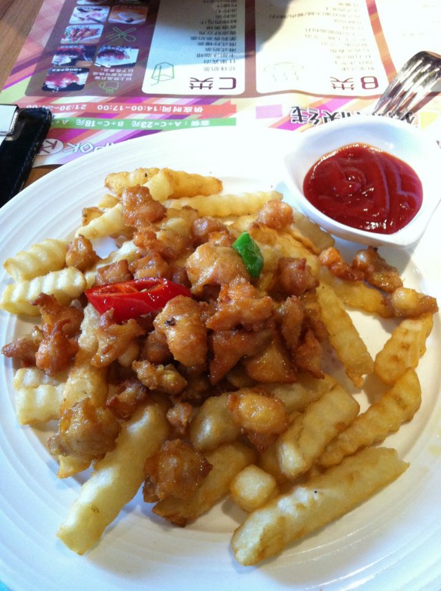 鸡米花等了好久哦。。上来的时候感觉不太热。拿了一块,一咬开,里面居然还没熟!!囧死。立马要求换一份。。这里态度依旧一般啊。出现这种情况也没任何歉意,囧。