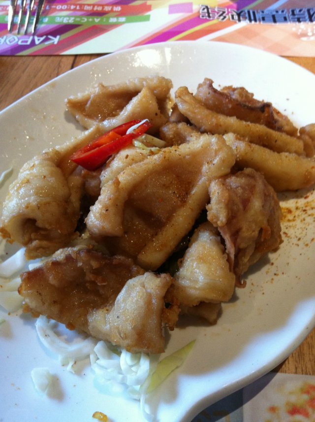 分量还可以。第一次吃这个菜,还是挺有惊喜的。椒盐味很足,墨鱼片很爽口,惹味啊。有一点小辣。