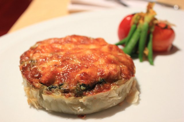 焗三文鱼菠菜挞:曾经觉得三文鱼最好是刺身,这样才鲜甜肥美。后来发现三文鱼还是稍微用盐简单煎熟就好了。这里的三文鱼菠菜挞芝士味超级浓郁,切开后能够有不错的拉丝,厨师应该至少用了两种不同的芝士才有这个效果。鱼肉和菠菜混在一起后,给人带来了特别的味道和口感,鱼肉也不腥,看上去不多,不过也挺饱腹的。