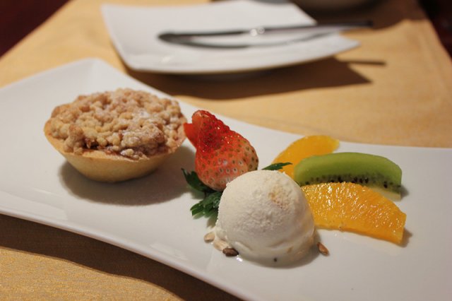 暖苹果挞配香草雪糕:加热后的苹果挞和蛋白批比起来甜太多了,上面的金宝面口感很好,但是吃多了会腻……一边加上雪糕大概是想要达到冰火两层天的独特味觉享受吧。香草雪糕很好吃,真的如丝绸般细滑,里面又有些小果仁,口感更好了。