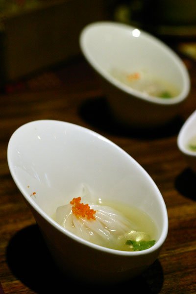 莲清鸡汤虾饺及金屋藏娇是全单中最值得推荐的两款点心。前者有如出水芙蓉,简约雅致,啖饺饮汤,回味悠长;后者暗藏暧昧,去其表象,原来是椰奶雪蛤窝于其中,确实藏了个娇呀。
