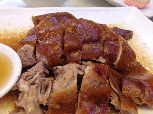 最先上的是点心,面包皮很酥软很香,里面有馅料,甜而不腻,十分可口,我食欲大增,不知不觉中就吃了两个。随后特价的鸡就出现在我们的眼前,具体价格我不记得了,大概是二十多元,总之是让我这样一个抠门的人不得不打呼便宜的价格与分量,鸡很嫩,皮很滑,葱头很新鲜,如此出色的品质与实惠的价格实在让人凡心大动,不过依稀记得只有午市有这个优惠。让我印象深刻的是那道虾,虾的外面包裹了一层芋头丝(应该是),很酥脆,炸得很有油香,而这道虾绝对不止这么简单,在虾肉和芋头丝之间还有一层沙律酱,酸酸甜甜的味道增强了这道菜对味觉的刺激,实在是享受啊!这里的烧鹅也是有优惠的,鹅肉很肥,很油,弄得我不是很敢吃,但是喜欢香口食物的食客应该会爱这道菜。东道主推荐卤水也不错,于是点了个鹅掌鹅翼来啃,卤得有味却又不会很咸,掌和翼也不会太瘦弱,啃起来还是挺有肉的,我啃了很多个,啃完之后不会猛喝水,过往我一吃咸点的东西就会不停喝水,所以这里的卤水我是真真喜欢啊!为了平衡饮食,我们还点了个杂菜煲,同事们说太淡了,但对于我这个口轻的人来说,炒得挺有味,能吃出蔬菜本来的味道,正好跟肉菜综合了一下。因为一桌都是女士,所以东道主还点了炖雪蛤来给大家滋补一下,味道嘛一般般,因为是十元一盅,里面的料也不多,当糖水喝着玩也还是可以的。