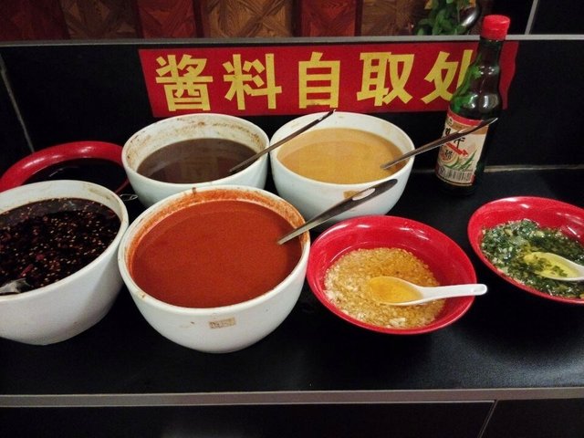 地址还算好找,很小的一个店面。有两层,二楼的酱料区,像自助一样,自己装自己配。有沙茶酱,花生酱,酱油,姜汁,葱油,辣酱油。