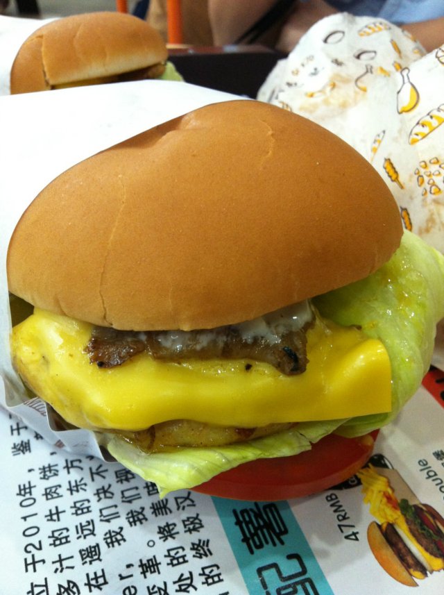 个头不算特别大啦。里面有新鲜烤制出来的鸡扒,蘑菇,番茄,生菜,洋葱,还有芝士。用料挺丰富。味道挺好的。里面很juicy的感觉。。就是吃一个有点唔够喉啊。哈哈。
