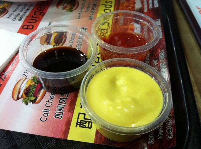 其实我觉得每张桌子上都配几瓶酱料会更好吧。好多人在酱料台上面把酱拿回去加,然后加完就不放回原位。囧。