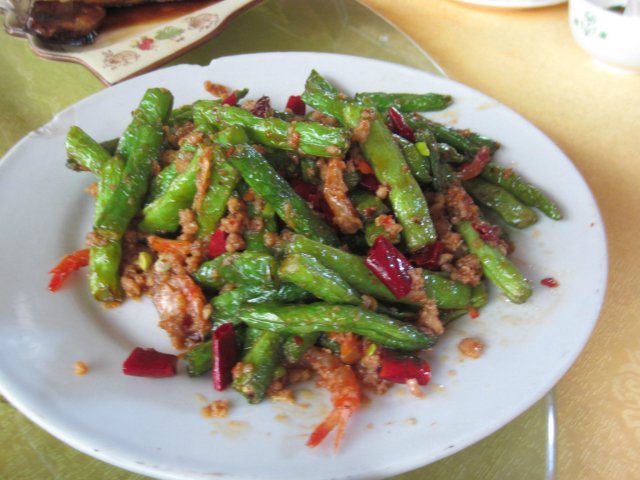 豆角炒虾干,豆角先用油泡过,然后用小虾干和辣椒拌炒,吃起来香辣有风味,吃得蚊滋停不了口哇!
