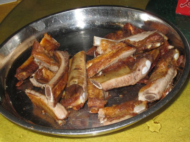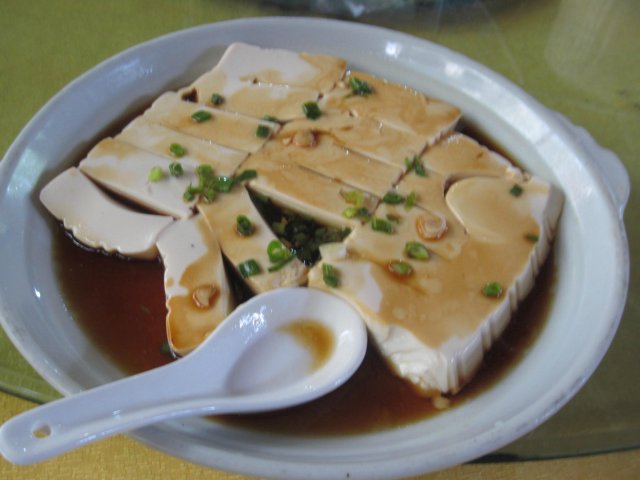 首先上来了烧排骨,好大一条吖,大家都不顾三七二十一,用手抓着来吃,其实骨头很大,肉不多,肉质结实,有炭烤的味道,虽说味道不是很惊艳,但不消十分钟,就清盘啦。山水豆腐好滑嫩,好新鲜,上面有葱花点缀,下面有酱油,味道好清新。