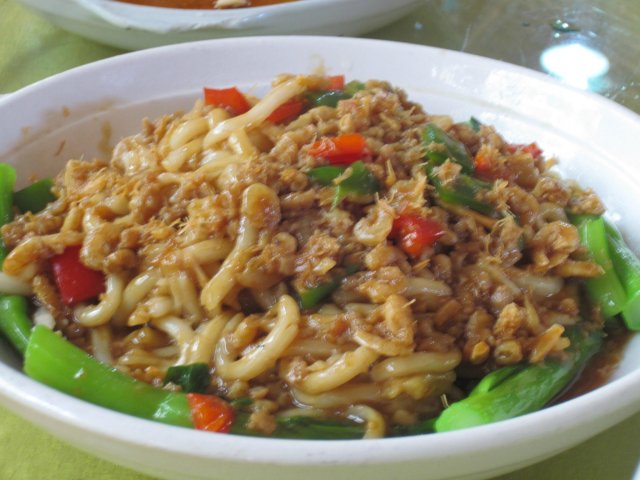 接着是蚂蚁上树,实质上一点儿也没有听起来那么恐怖啦。周围配上几条菜心,底下全都是类似米粉的东西,上面铺着用辣椒和葱丝拌炒的肉碎和小虾干,肉碎和小虾干味道惹味,那个米粉就觉得一般了。