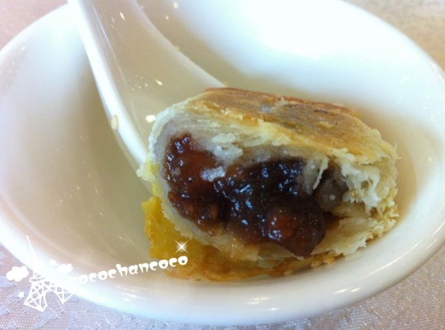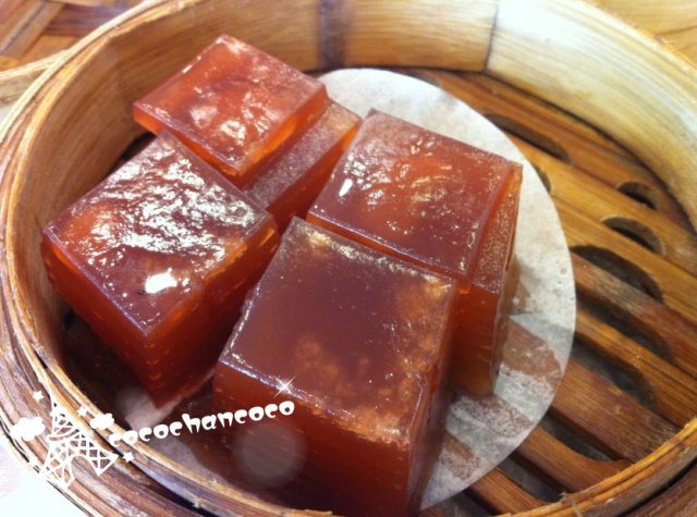 叉烧酥一碟三件,通过筷子已感受到酥的松化,轻咬之下入口即化,皮薄馅靓。养颜枣皇糕卖相一般,还有两块薄片脱出。从色泽来看与其他餐厅的出品无异,可惜红枣味淡,糕太粘口,失败之作。