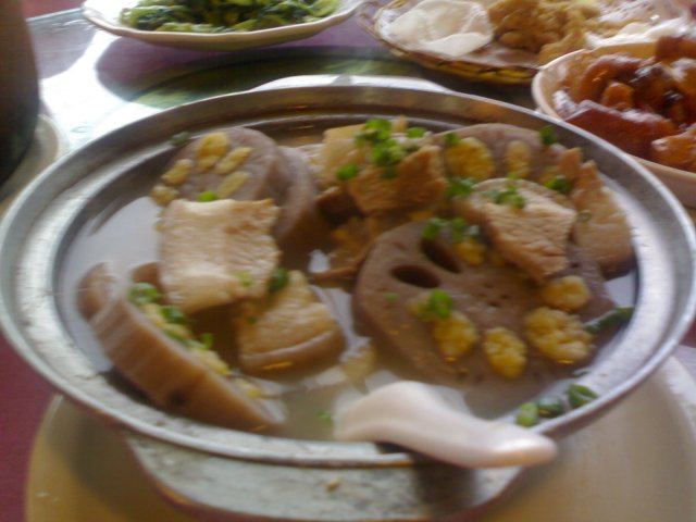莲藕煲,很大一煲,莲藕很粉,猪展肉肥而不腻,汤很甜。