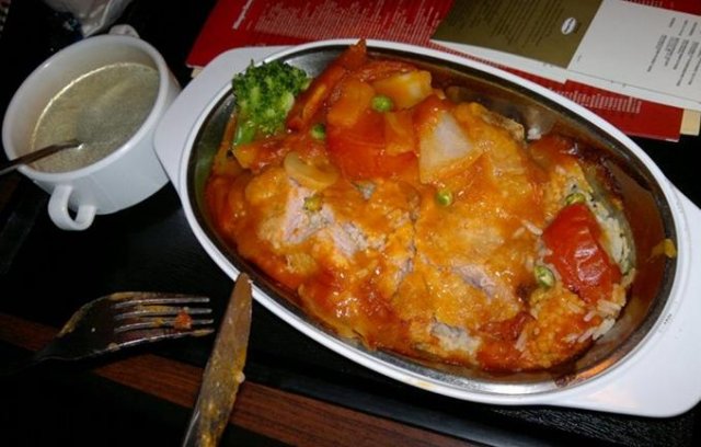 另外,除了烧春鸡,平时食得最多的就是一哥猪扒饭了,大大块的猪扒,而且饭是焗过的,很弹牙,但是就有点干了,有时候,猪扒里面有很大的骨,切起身很不方便。而且洋葱等等的配料的也很多。