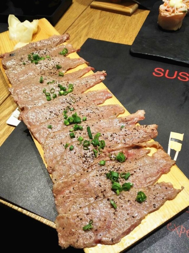 葱烧和牛刺身。6成熟是被赞赏的熟度,多汁没有血腥味,牛味很浓,32个赞。