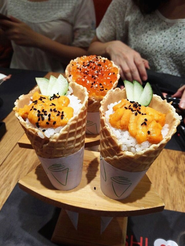 人地必食之二:雪糕筒。小伙伴都不约而同点新品了。新加入雪糕筒家族的有:海胆、鱼籽、北极贝,红蟹籽,加上之前的鳗鱼、三文鱼、吞拿鱼,7款口味喔~~