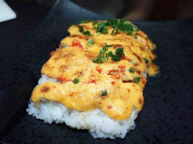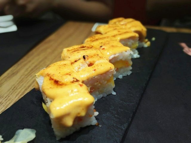 热浪三文鱼千层。人气必食的。蛋黄芝士沙拉酱经过火焰的洗礼,散发着浓浓的香气包裹着整个千层。芒果,牛油果,三文鱼及蟹籽的丰富馅料,再加入粟一烧的创意搭配,怎么能不登上人气寿司之位呢??