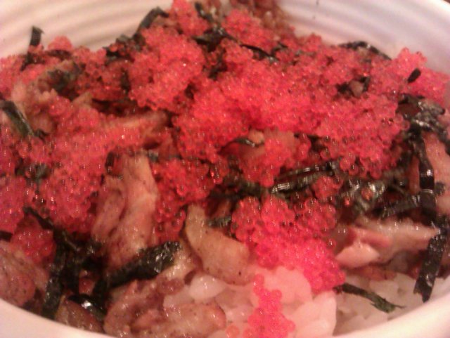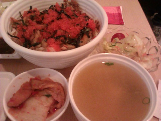 三文鱼拼蟹籽饭,满满一碗,除了有炒熟的三文鱼粒,里面中加左紫菜和蟹籽,将几样野拌饭吃,口感层次丰富,每一口都有蟹籽跃动的弹牙感觉。