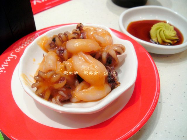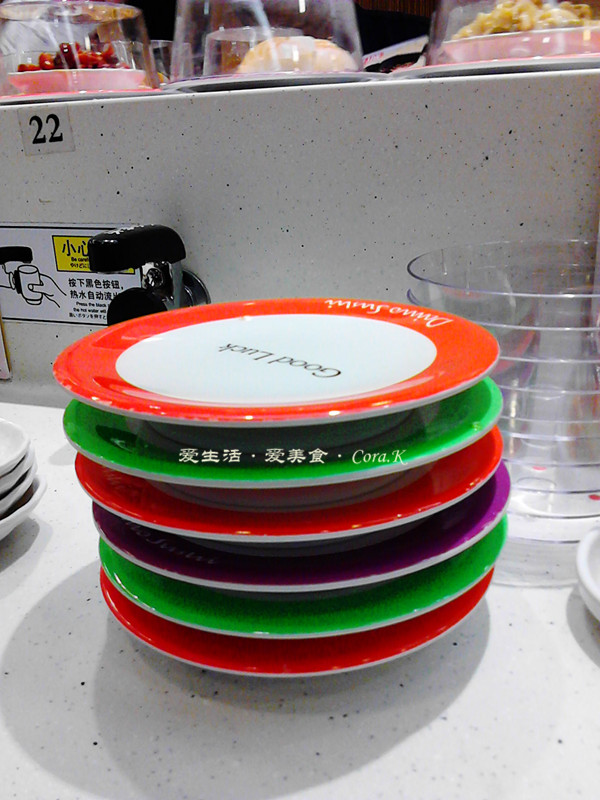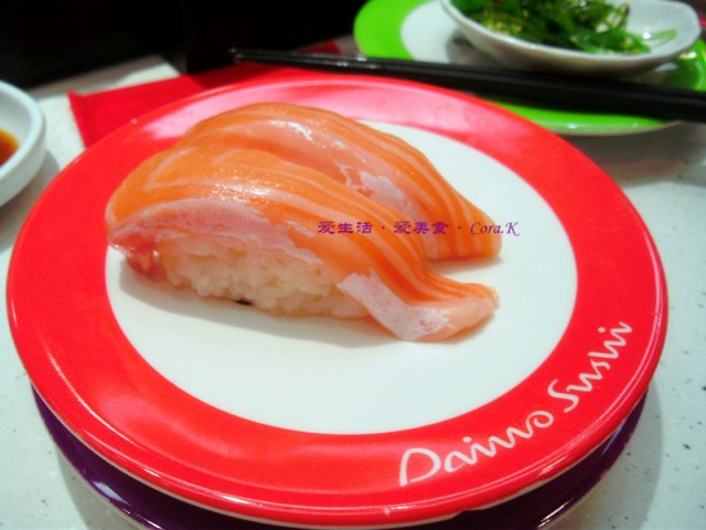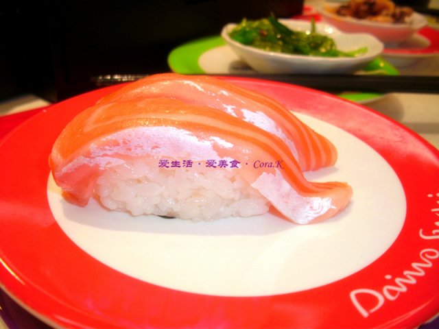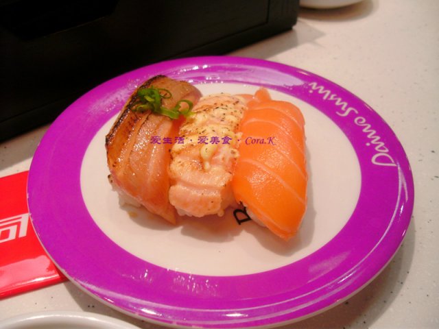 老公不喜寿司,点了一份推荐的日式炒乌冬,而我则对着色彩缤纷的回旋带发起了呆,实在太久太久没有这样吃寿司了,有那么点眼花缭乱,不知道该从何下爪,喝了口玄米茶,炒麦粒那独有的焦糖香加上绿茶末那淡淡的清香让我定了定神,而那份紫装的三味三文鱼亦正好来到了我面前,该出手时就出手,至此便拉开了我今年首次寿司午餐的序幕。