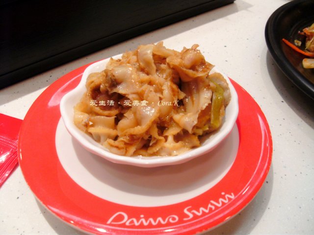 虽然有些饱,但看着老公吃还是有些不甘寂寞地又拿了一碟带子裙边,一揭开盖子的时候芝麻油的香味迎面扑来,很是诱人,贡菜很爽脆,就是少了些,裙边的口感处理得有些像白灼牛栢叶,脆中带韧,可惜味道还是偏甜。
