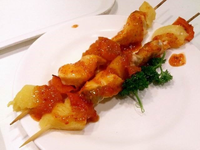 三文鱼串:三文鱼与菠萝的合体,淋上甜辣酱,其实鱼的味道真的不突出。