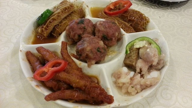 排骨、凤爪、金钱肚、牛仔骨大四喜(48元一例):由于当日没有牛仔骨,商家说在排骨、凤爪、金钱肚三种换其中一种,另外在原分量的基础在加一点。我们就挑选了金钱肚,感觉好像没有怎么多。排骨蒸的还不错,凤爪非常霖,酱汁够,金钱肚有部分咬不烂,酱汁够。
