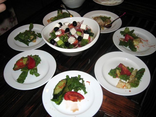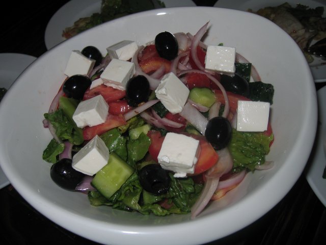 希腊沙拉:由黑橄榄、芝士粒、蕃茄、青瓜、洋葱丝等搭配,营养丰富,沙拉里面的芝士粒很香浓,是一道不错的美容食品。
