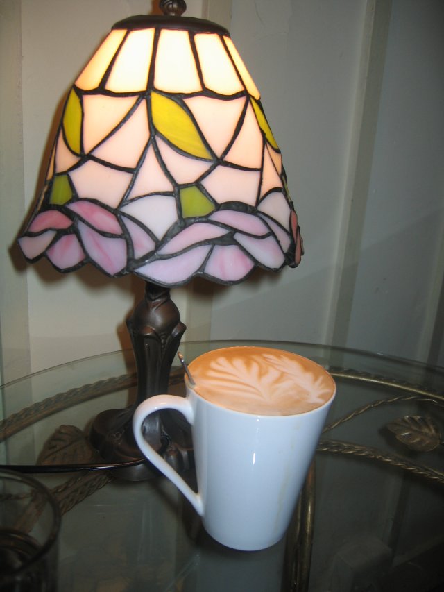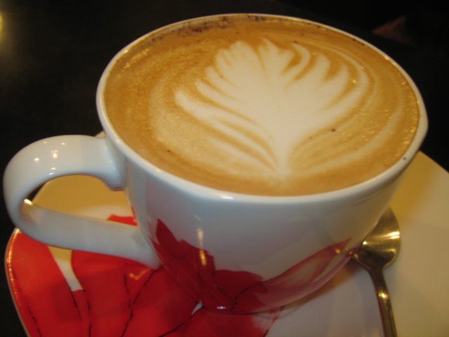 卡布奇诺:红花图案相衬的啡杯,配有1包咖啡糖,卡布奇诺的拉花非常漂亮,使人不忍破坏杯中拉花的美,放了很久,我才细细品味这杯极品,咖啡香浓可口,泡沫细腻丰富,奶泡打得很丰盈,也很扎实,不会有苦涩味道,也不会太甜,很好喝。