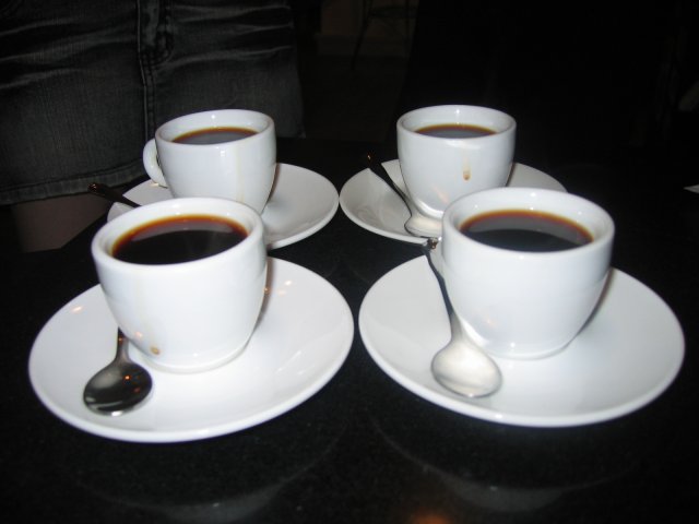 巴西单品咖啡:我喝咖啡喜欢多奶、多糖,有位靓女点了这个咖啡,她把1杯大咖啡分为4小杯,征得靓女同意,我用没有使用过的小勺子,拿来试一下,觉得这种咖啡很苦,糖和奶都没有,不适合我喝,但这杯咖啡很浓的咖啡味,很适合喝斋咖的朋友享用。