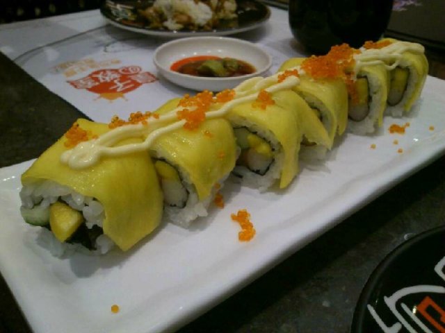 【香芒寿司】全名也是忘了,朋友口中清新过初恋的寿司,哈哈,卖相不错啊,本来看着觉得外面那层青青的芒果会酸,结果不会诶,芒果很甜,中间有芒果、青瓜、三文鱼、蟹柳,吃起来真的很清新,跟平时吃的寿司太不一样的,强烈推荐哦~价格忘了诶~