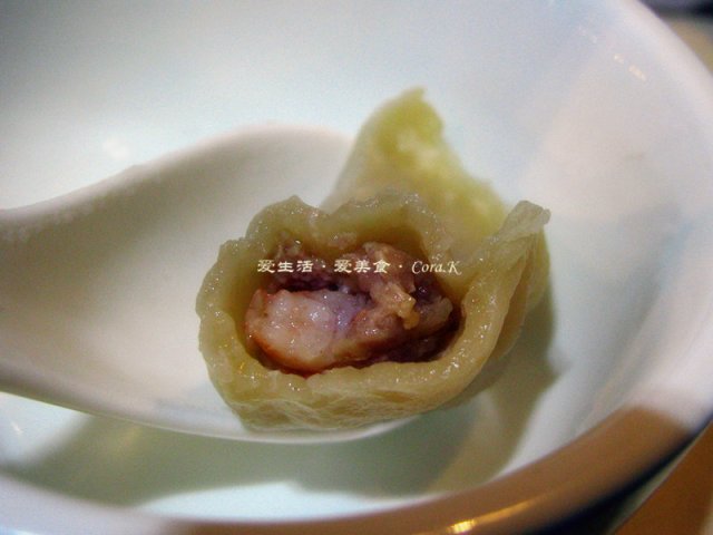 虾仁鲜肉蒸饺的皮则有些嫌厚了,广式蒸饺的皮那才叫薄的,而且薄得几近透了,口感也是极好的,这儿的虾仁鲜肉蒸饺的亮点就在于那皮内的一泓鲜汤,虾仁的个头不算大,但比例正好,口感一般爽,是汤带出了馅的鲜甜,如果皮能改进改进还不错。