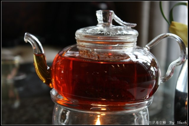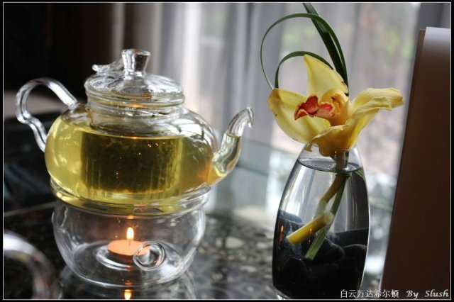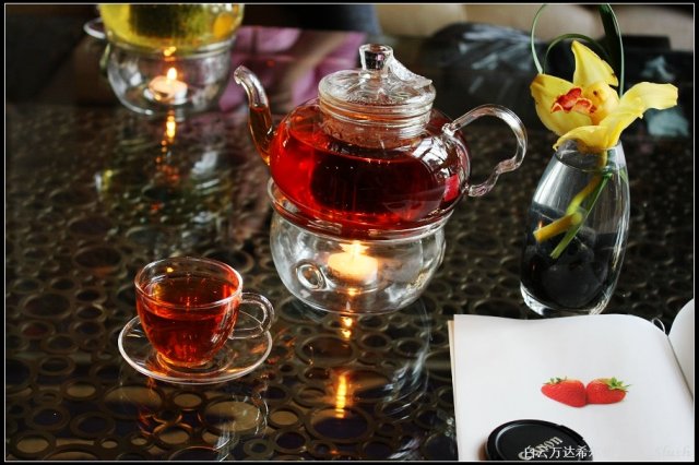 东西上来得也很快,茶,我的是柠檬草茶,橙色的,圆圆的茶壶,下面还有蜡烛燃烧加热•••很不错~~~喜欢这个味道~~