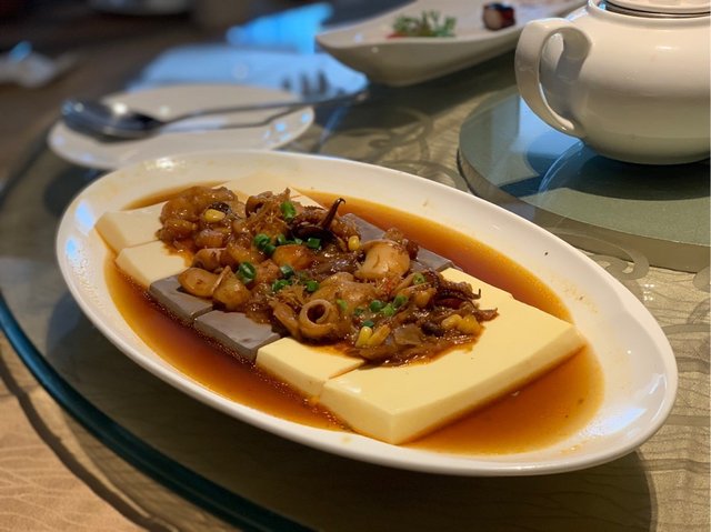 ,例如魷魚、干貝等,和滑溜的黃豆豆腐和黑豆豆腐非常夾,淋上海鮮醬,非常驚喜的一道小菜
