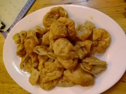 值得一提系佢嘅面筋,要16元一份可以讲非常贵,上菜见到一大碟都算够分量,最主要系D面筋炸得啱啱好,用来打边炉一流,不过我吃面筋吃出一条胶带(看我发嘅相片)
