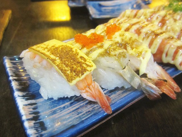 这3件寿司是一个系列的,都是虾为主体,不同的虾用不同做法配上不同配料,特价9元3件,也不错的,可以多试几种味道。